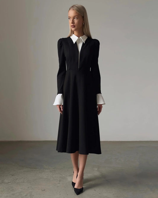 Shirt Collar Black and White Midi Dress